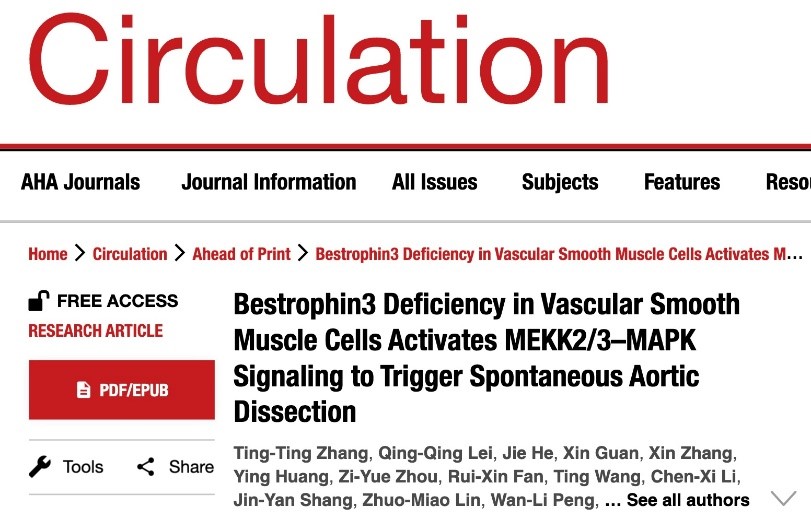 2023年5月20日,Williamhill中文周家国教授、william威廉英国附属第八医院黄辉教授和广东省中医院范小平主任合作,在Circulation期刊(心血管领域顶刊,IF: 39.9)上发表了题为“Bestrophin3 Deficiency in Vascular Smooth Muscle Cells Activates MEKK2/3–MAPK Signaling to Trigger Spontaneous Aortic Dissection” 的论文,报道了Bestrophin3-MEKK2/3信号轴在调控血管平滑肌细胞(VSMC)表型转换和AD形成中的关键作用。
