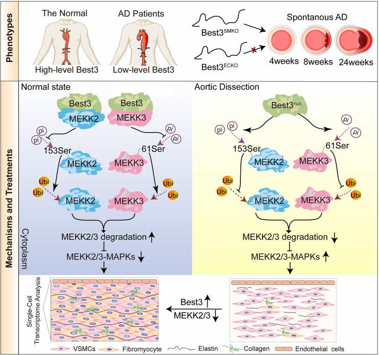 综合以上,该研究明确了纤维肌细胞亚群在维持血管稳态中的重要作用,其丢失是AD形成的关键细胞学特征。同时,发现Bestrophin3是MEKK2/3-MAPKs通路的内源性“刹车”分子,血管平滑肌细胞Bestrophin3缺乏或MEKK2/3过度激活是AD形成的关键分子机制,表明Bestrophin3-MEKK2/3信号轴有望成为防治AD的有效新靶点。