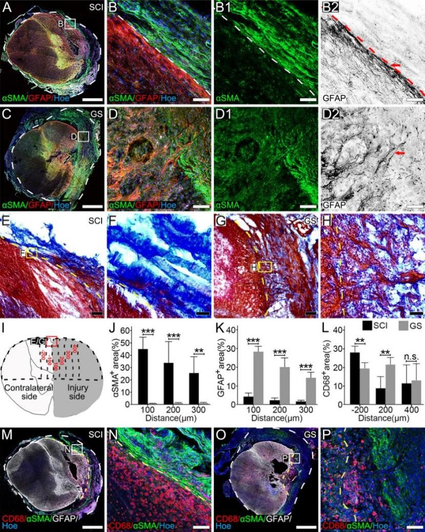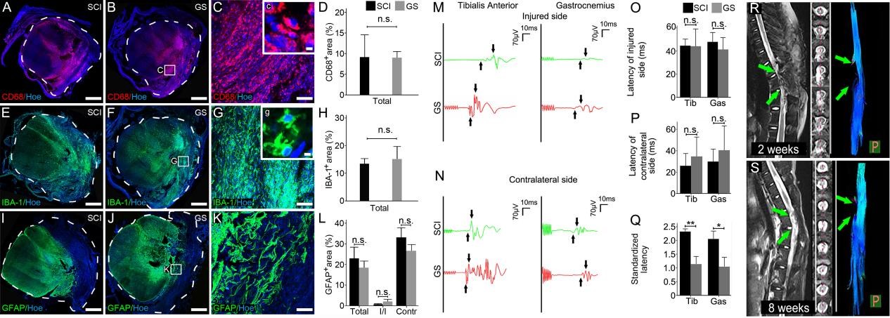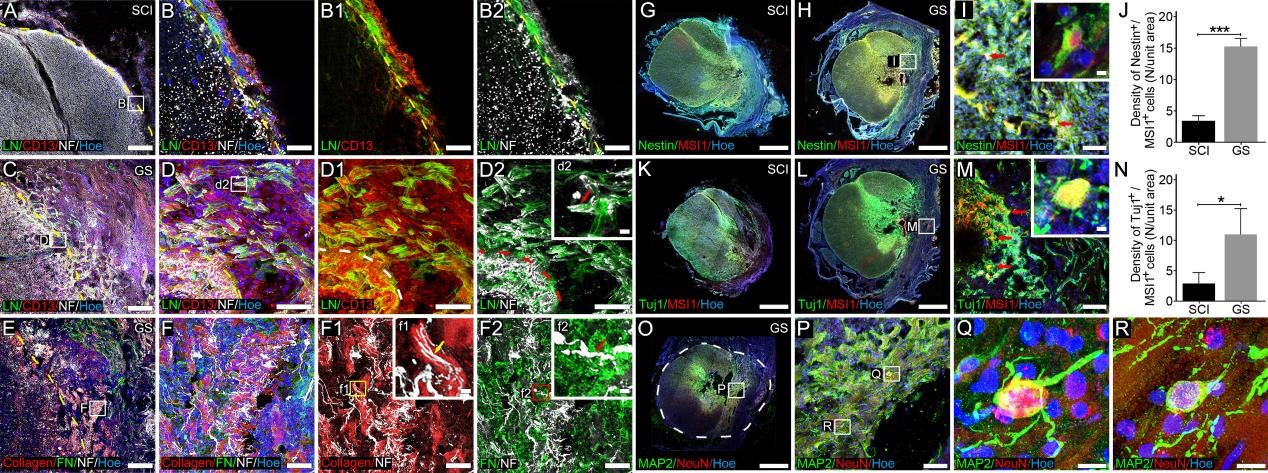 此外,组织学分析发现有数量众多的组织细胞迁移到植入三维明胶海绵支架材料中,并分泌丰富的细胞外基质,在受损伤脊髓中形成促再生微环境,增强神经组织再生(图2)。