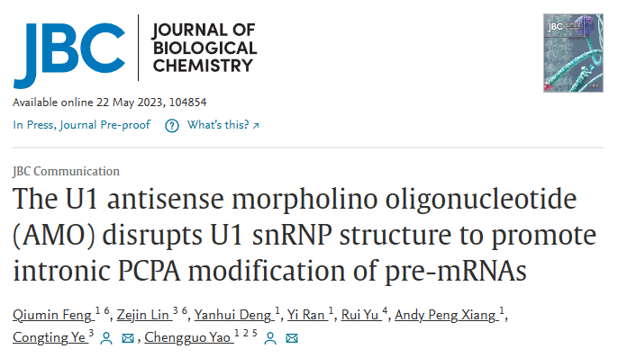5月22日,我院干细胞中心姚成果课题组与厦门大学叶从庭课题组合作在JBC期刊(Journal of Biological Chemistry, 生化领域权威期刊)发表了题为”The U1 antisense morpholino oligonucleotide (AMO) disrupts U1 snRNP structure to promote intronic PCPA modification of pre-mRNAs”的论文,报道了针对领域内这一重难点问题的最新研究成果。这是该课题组近年在mRNA长度调控领域的又一进展(2017,NAR; 2018,2019,2021,2022,RNA Biol.; 2020,BBRC)。