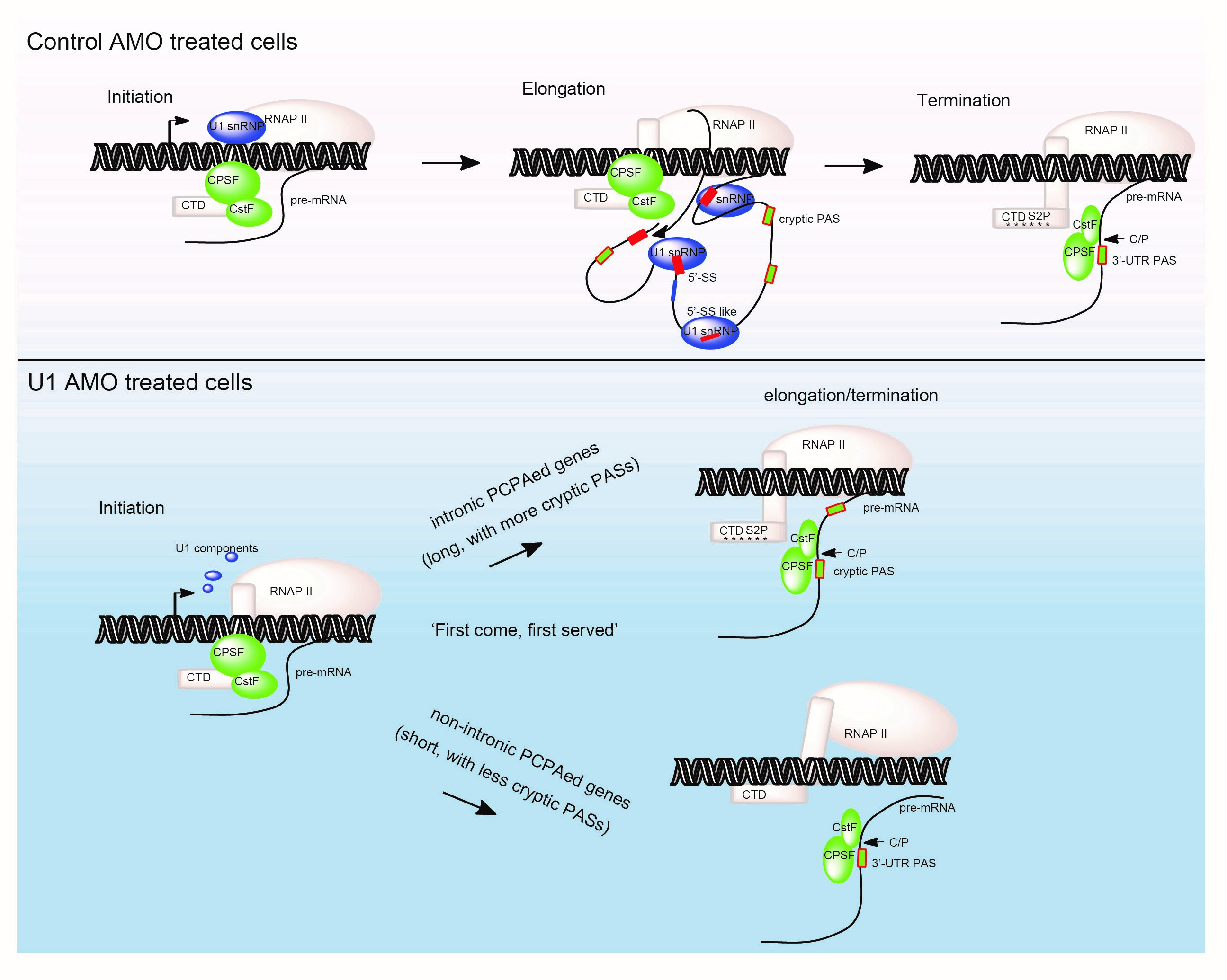 进一步针对核心mRNA3'末端加工因子CPSF/CstF的ChIP-seq和iCLIP-seq实验表明,U1 AMO处理条件下,CPSF/CstF在共转录加工过程中被提前招募到染色质基因组上,并与内含子内polyA site相互作用,而造成pre-mRNA变短。