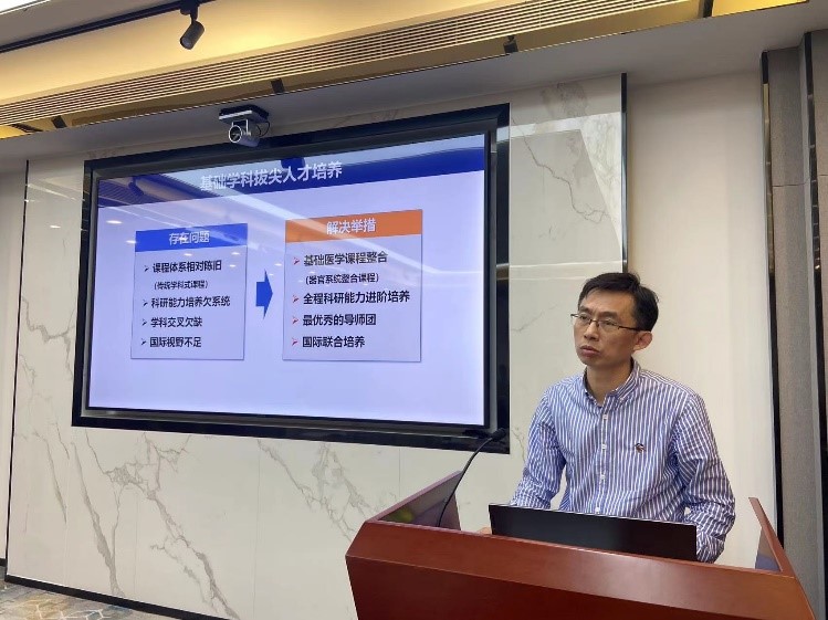 郭开华院长助理结合基础医学专业人才培养工作实际,就基础拔尖人才培养改革探讨进行重点发言。他从教育部基础医学“101计划”工作研讨会会议内容进行导入,详细汇报了我院关于基础医学拔尖人才培养方案。郭开华指出,我院始终坚持立德树人根本任务,积极探索基础医学拔尖人才培养改革,全面提升基础医学拔尖创新人才自主培养能力,强化交叉融合,深化拔尖创新人才机制创新和模式变革,构建高质量基础学科拔尖人才自主培养体系。