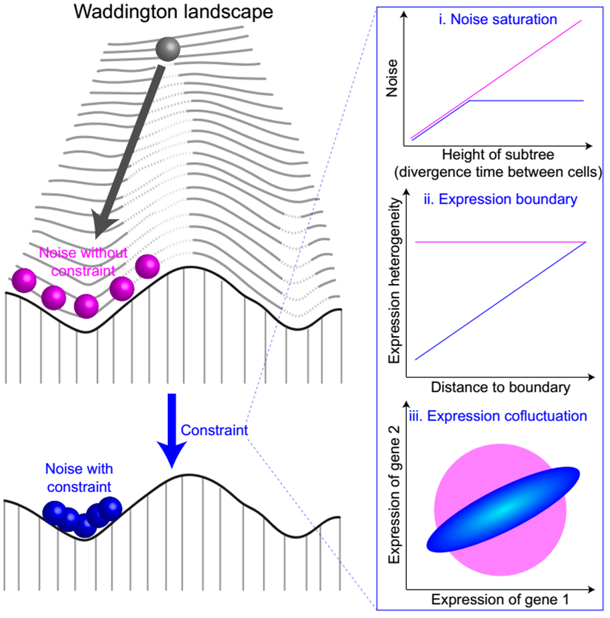 研究人员以提高细胞采样效率为目标,构建并优化了一个基于Cas9的细胞谱系追踪系统及其实验与分析流程,并获得一个HEK-293单克隆细胞群中>50%细胞的单细胞表达谱和谱系树。分析表明,细胞间的表达谱差异并未随着克隆增殖而无限增长,而是在4次细胞分裂后就趋于饱和。通过单细胞表达谱和谱系树,研究人员推导出祖先细胞的基因表达谱,并发现祖先细胞基因表达越接近特定表达边界,其后代细胞的基因表达就会受到更大的限制,表达差异会越小。不同基因间表达量的比较则揭示了某些基因之间存在显著的共同波动(co-fluctuation)现象,进一步限制了不同细胞转录组之间的差异。在发育生物学经典的Waddington景观模型(Waddington landscape,见下图)下,上述机制共同构成了“山峰”,对每个细胞的转录组形成了约束,保证它们被限制在特定细胞类型表型稳态的“山谷”内。