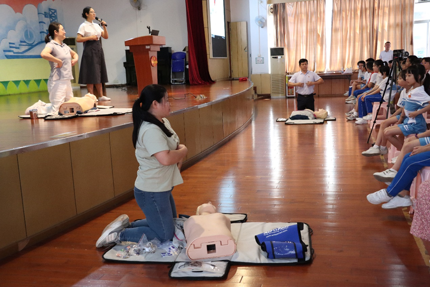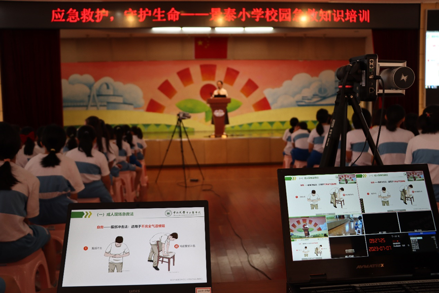 (一)2023年7月7日,支部以“走出去”形式开展“科创筑梦”系列活动的第一次正式活动:组织了王亚琼、伍慧勤、江珍和徐达政等科普讲师团老师走进广州市景泰小学为该小学线上下共1500名师生开展“应急救护,守护生命”——景泰小学校园急救知识培训”讲座活动。