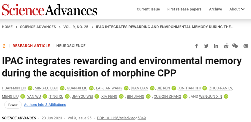 2023年6月23日,Williamhill中文信文君教授、蒋斌教授,william威廉英国附属第一医院冯霞教授和广州医科大学张雪琴教授合作,在Science Advances期刊上发表了题为“IPAC integrates rewarding and environmental memory during the acquisition of morphine CPP” 的论文,报道了两条投射到IPAC(前联合后肢间质核)的神经环路:VTAGABA→IPACLGABA和NAcShD1→IPACMGABA分别介导吗啡CPP(条件位置偏爱)获得过程中的奖赏记忆和环境记忆,并为预防和治疗阿片类药物成瘾提供了基于神经环路的潜在靶点。