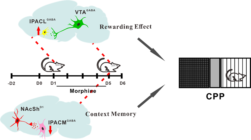 本研究以中脑多巴胺系统为出发点,主要研究了IPAC在吗啡成瘾形成过程中参与奖赏和环境记忆的神经环路机制。通过建立大鼠吗啡CPP模型,借助环路示踪、化学/光遗传技术、在体钙信号记录等手段观察到在吗啡CPP过程中,每次吗啡使用都会激活VTAGABA→IPACLGABA,并通过对IPACL的去抑制作用介导奖赏效应的形成;而多次重复的吗啡给药抑制NAcShD1→IPACMGABA环路,通过促进环境记忆的形成参与CPP过程。我们的实验结果定义了两条投射到IPAC的精细神经环路:VTAGABA→IPACLGABA和NAcShD1→IPACMGABA分别参与了吗啡CPP形成的奖赏和环境记忆,共同促进药物成瘾。这项研究为成瘾疾病相关的神经回路提供了有价值的见解,为预防和治疗阿片类药物成瘾提供潜在神经环路靶点,这可能有利于未来开发新的治疗方法。