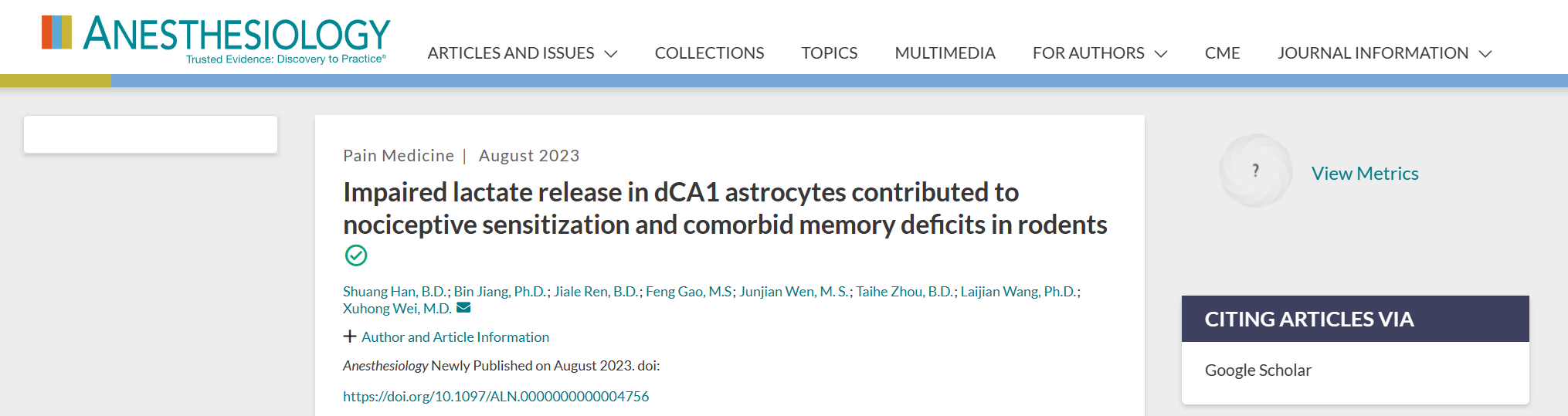 2023年8月31日,我院魏绪红副教授、蒋斌教授团队合作在麻醉学顶级期刊Anesthesiology(中科院1区,top)发表了题为“Impaired lactate release in dCA1 astrocytes contributed to nociceptive sensitization and comorbid memory deficits in rodents”的论文,探究了背侧海马CA1区星形胶质细胞乳酸释放减少在痛觉过敏和记忆障碍共病中的作用。