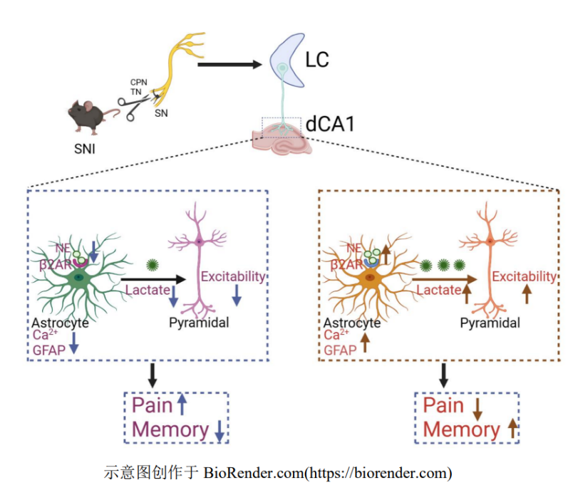 此研究利用坐骨神经分支选择性损伤模型(SNI)小鼠,发现10天后即出现共病,同时, 背侧海马CA1星形胶质细胞钙信号对机械痛刺激的反应明显减弱、星形胶质细胞GFAP表达量以及分支明显减少,乳酸含量明显降低,离体全细胞膜片钳发现锥体神经元内在兴奋性明显下降。而在 SNI 鼠 CA1区外源性补充乳酸能够提高机械痛阈、引起条件位置性偏爱、提高新奇事物认知能力并提高锥体神经元的兴奋性。相反,在正常动物用糖原磷酸化酶抑制剂抑制 CA1 乳酸合成或通过抑制单羧酸转运体阻断乳酸转运到锥体神经元,均引起正常动物痛觉过敏和记忆障碍。化学遗传学特异性激活蓝斑(LC)到背侧海马CA1 去甲肾上腺素能投射能缓解共病。