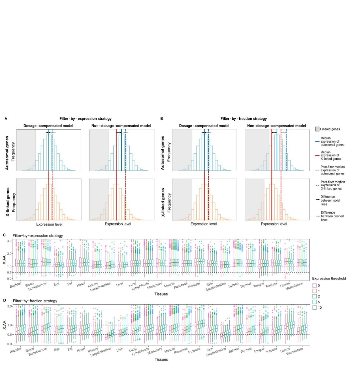 研究人员首先使用模拟scRNA-seq和bulk RNA-seq数据集评估了两种常见的X:AA基因选择策略,即按基因表达水平过滤和按基因表达比例过滤。他们发现这两种策略都会产生夸大的X:AA表达比率,从而人为地支持剂量补偿模型。
