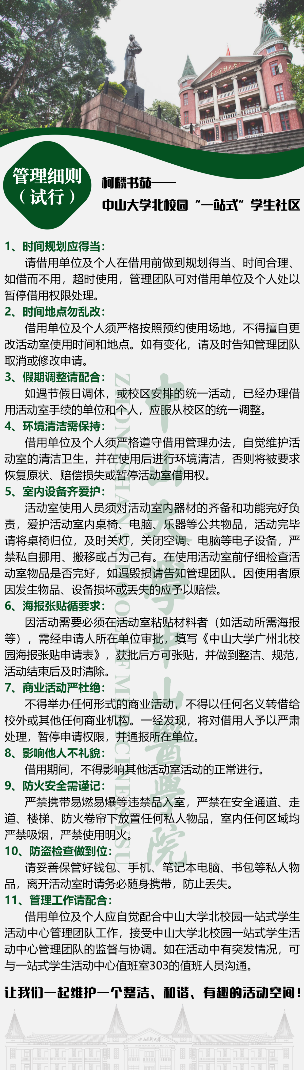 使用结束后整理活动室物资清洁卫生带走个人物品,在303值班室进行签出登记