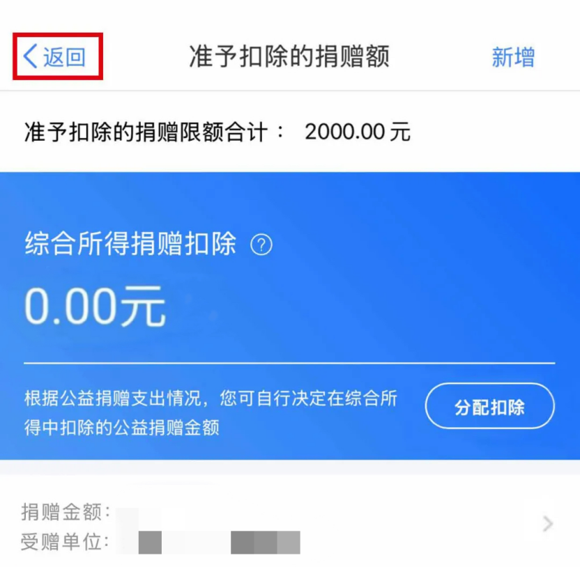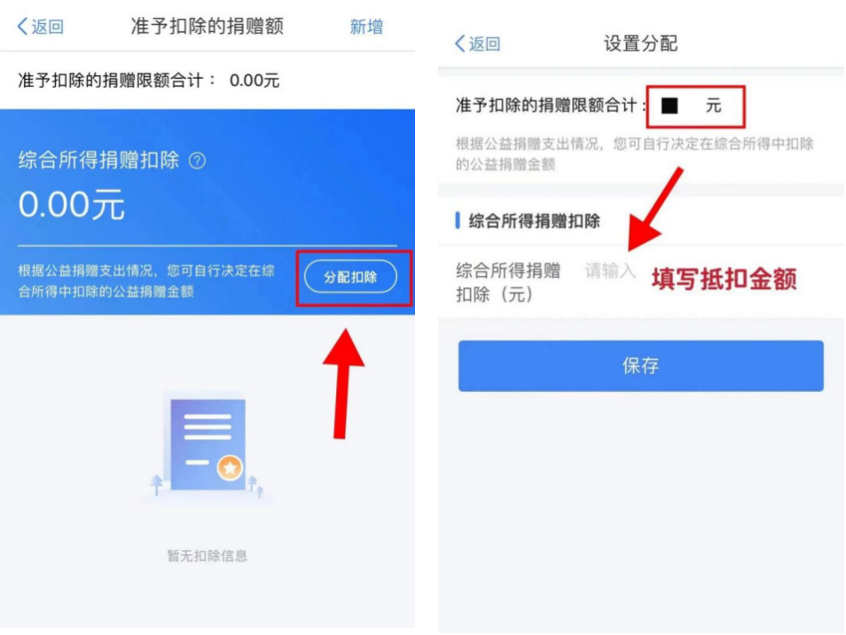 所有捐赠票据信息输入完毕保存后,点击返回,在页面选择“分配扣除”,填写“综合所得捐赠扣除”金额,点击“保存”即可。