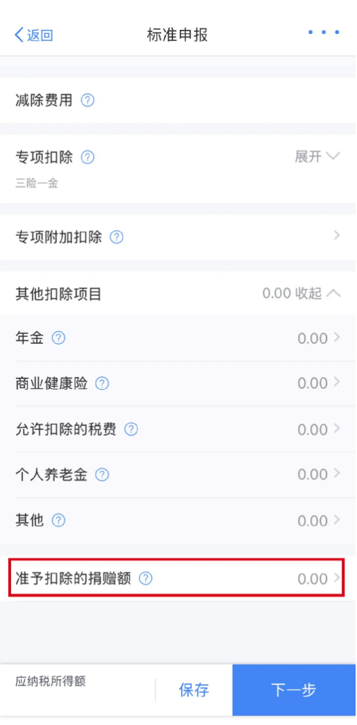 进入“收入和税前扣除”部分,划到最下方,点击进入“准予扣除的捐赠额”;