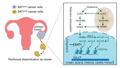 研究发现,低氧诱导SAT1高表达,而SAT1通过促进肿瘤细胞非锚定生存,进而增强盆腹腔转移。SAT1高表达的癌细胞在恶性腹水中普遍存在。SAT1通过直接乙酰化有丝分裂关键调控基因的H3K27结构域,提升其转录水平,进而保护非锚定的转移细胞免于有丝分裂灾难与细胞死亡。SAT1对H3K27的乙酰化作用,依赖于谷氨酰胺通过还原羧化途径提供乙酰辅酶A。研究还发现,药食同源的天然产物银杏内酯B可有效抑制SAT1活性,显著降低小鼠模型中的转移性肿瘤负荷。