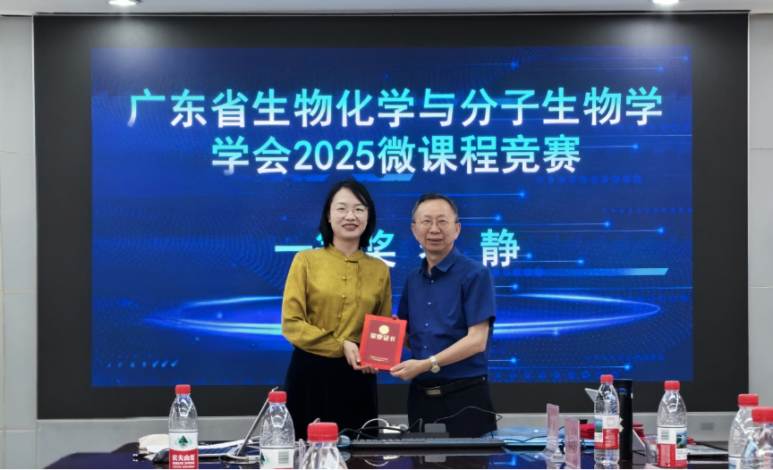 近日,在2025年广东省生物化学与分子生物学学会微课程竞赛中,我院生物化学与分子生物学系蔡静副教授凭借出色的教学能力和深厚的学术底蕴,在紧张激烈的竞赛角逐中脱颖而出,荣获一等奖。