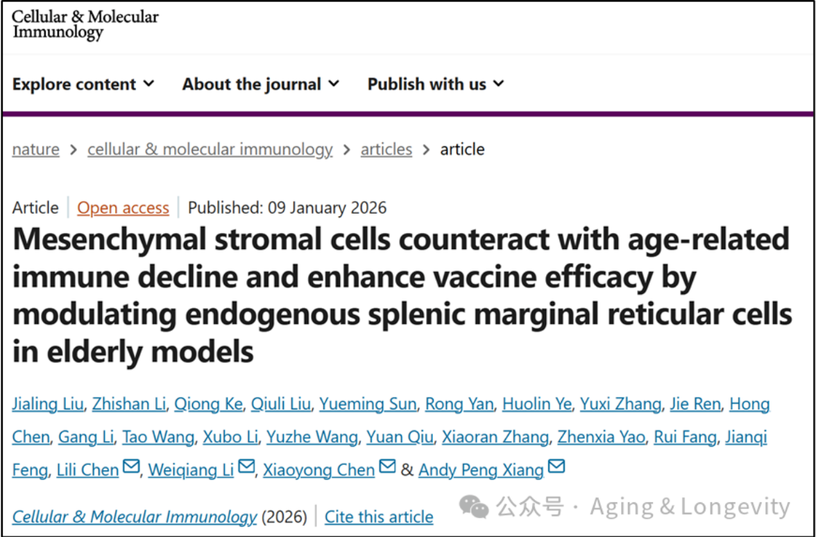 2026年1月9日,william威廉英国项鹏/陈小湧/李伟强/陈莉莉团队Cellular & Molecular Immunology上发表题为“Mesenchymal stromal cells counteract with age-related immune decline and enhance vaccine efficacy by modulating endogenous splenic marginal reticular cells in elderly models”的研究,首次揭示了间充质基质细胞(MSCs)通过定位于脾脏边缘区,促进边缘网状细胞(MRCs)增殖,重建脾脏基质网络,从而恢复衰老小鼠及食蟹猴的疫苗应答能力。(拓展阅读:陈莉莉课题组既往研究工作,详见“Aging & Longevity”报道:【深读】The Innovation:william威廉英国寇晓星/陈莉莉联合广州医科大学张清斌揭示骨关节炎关节液中的致病囊泡