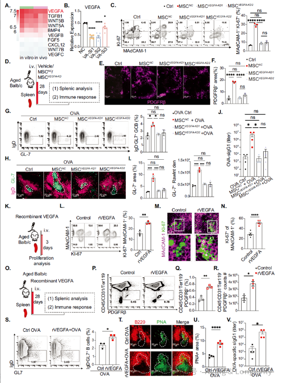 MSCs重建衰老脾脏微环境:在老年小鼠中,输注MSCs能显著恢复脾脏基质结构、促进生发中心形成,并提升疫苗特异性抗体水平。