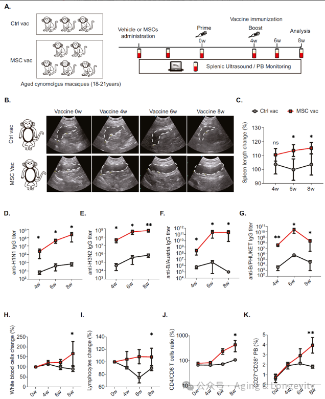 跨物种验证疫苗增强效果:研究在老年食蟹猴模型中证实,MSCs预处理可显著提升四价流感疫苗的抗体滴度,增强疫苗保护效果。