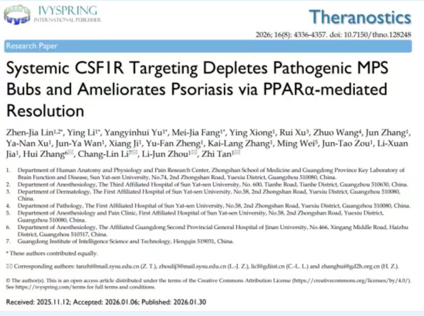 近日,Williamhill中文谈智/周利君教授团队,联合广东省智能科学与技术研究院李昌林研究员及暨南大学附属广东省第二人民医院张辉主任团队,在生物医学期刊 Theranostics(JCR 1区,中科院医学大类1区,新锐分区1区,IF: 13.3)上发表研究论文,揭示了CSF1R-PPARα轴在驱动银屑病皮肤及全身炎症中的核心作用,并提出系统性靶向CSF1R是重建免疫稳态、促进炎症消退的有效策略。