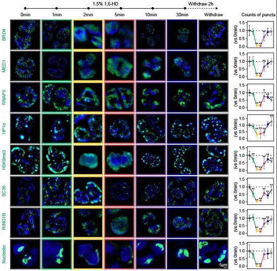 细胞内广泛存在相分离(Phase Separation)现象,成千上万的蛋白或核酸分子在复杂的细胞内部形成一个一个无膜“隔间”,就像油滴在水中一样,彼此互不干扰地参与细胞内如转录调控、应激、蛋白质质量控制、DNA复制等多种重要的生物学过程。1,6-己二醇1,6-HD)是一种能够使得相分离液滴溶解的化学小分子,它是目前唯一的能同时破坏多种相的工具,所以非常有潜力应用于研究全局层面上相分离现象与其他生物学进程或结构之间的关系。但是,在不同的研究中,1,6-HD的应用条件千差万别,没有统一的标准,某些条件甚至会导致细胞凋亡、蛋白异常凝集、细胞皱缩、染色质“冻结”等副作用,这大大阻碍了这一工具的应用。