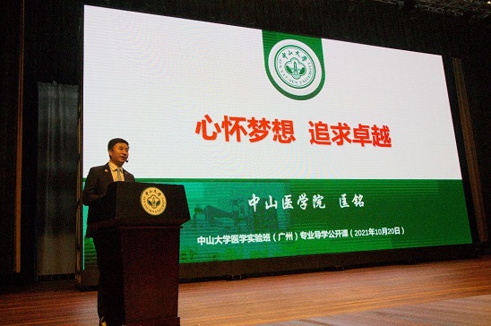 2021年10月20日,Williamhill中文在广州校区南校园梁銶琚堂为2021级医学实验班(广州)开设专业导学公开课。Williamhill中文院长匡铭教授以“心怀梦想,追求卓越”为主题授课,副院长王淑珍主持课程。院长助理郭开华、党政办主任满意、党政专职辅导员黄山及700余名医学实验班新生等参加此次公开课。