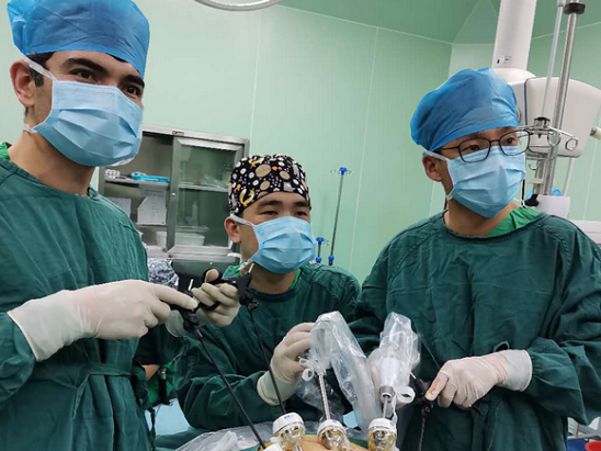 附属第三医院援疆医生罗云(右一)腹腔镜微创手术中