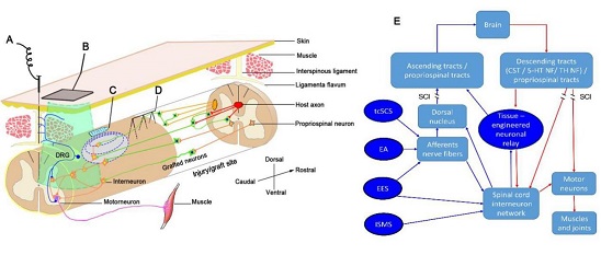 图示:干细胞源性神经元中继器联合功能性电刺激重构上下行神经环路修复脊髓损伤。A.电针刺激(EA);B. 经皮脊髓电刺激(tcSCS);C. 硬膜外电刺激(EES);D. 脊髓内微电极刺激(ISMS);E. 组织工程神经元中继器联合功能性电刺激重构上下行神经环路修复脊髓损伤的神经通路解析。