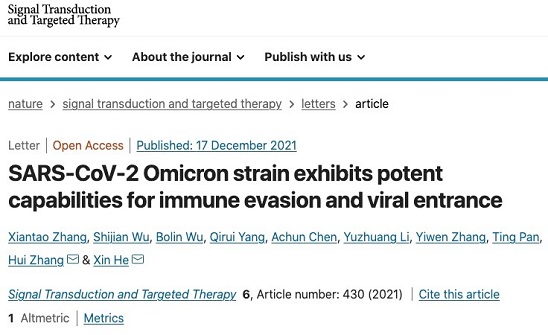近日,我院何欣团队、张辉团队在《Signal Transduction and Targeted Therapy》(STTT)期刊上(IF:18.18)发表了题为:“SARS-CoV-2 Omicron strain exhibits potent capabilities for immune evasion and viral entrance”的报道,研究发现Omicron突变株针对新冠患者康复血清具有极高的免疫逃逸能力,且其入侵靶细胞的能力显著增强。该研究提示新冠病毒突变株对现有以早期株为蓝本开发的疫苗免疫很可能造成突破性感染,加速针对奥密克戎的特异性疫苗及治疗性抗体的研发策略具有显著意义。