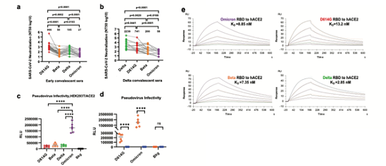 图注:(A)早期新冠感染(G614)与(B)Delta感染后的康复血清,对奥密克戎的中和效果均严重削弱;(C) 奥密克戎假病毒介导感染HEK293T-ACE2细胞能力提高近10倍;(D) 奥密克戎假病毒不能感染没有ACE2过表达的HEK293T;(E)奥密克戎的RBD蛋白仍维持了较高的与ACE2蛋白受体的结合能力