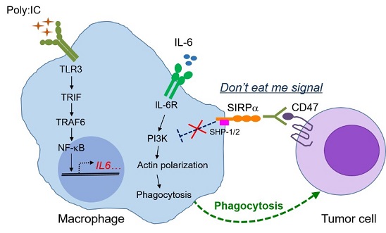 本文通过体外吞噬实验和体内实体瘤动物模型,发现Poly(I:C)与CD47抗体的联合作用促进了巨噬细胞对结肠癌细胞的吞噬能力,抑制了肿瘤的生长。Poly(I:C)通过激活TLR3产生IL-1β和IL-6等炎性细胞因子,体外实验表明IL-6刺激的巨噬细胞在CD47抗体的作用下,明显提高巨噬细胞吞噬,敲除IL-6能减弱Poly(I:C)与CD47抗体联用后的抗肿瘤效果。当巨噬细胞吞噬抑制性信号通路被CD47抗体阻断后,Poly(I:C)诱导IL-6的产生,促进下游PI3K的磷酸化,激活Rac GTPases,导致细胞骨架的重排,从而促进了巨噬细胞吞噬。本研究不仅为实体瘤免疫治疗提供新的策略,同时揭示了IL-6在CD47抗体肿瘤免疫治疗中的新机制。