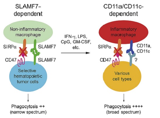 近年来基于巨噬细胞的肿瘤免疫疗法受到越来越多关注,CD47-SIRPa是巨噬细胞上最重要的抑制性免疫检查点之一。肿瘤细胞高表达CD47,通过与抑制性免疫受体信号调节蛋白SIRPa结合,进而抑制巨噬细胞吞噬作用。CD47-SIRPa信号通路的阻断有效激活巨噬细胞对肿瘤细胞的吞噬作用及下游的抗肿瘤免疫反应。我院陈俊教授团队前期研究发现阻断CD47-SIRPa可以促进巨噬细胞吞噬血液瘤细胞,但在实体瘤细胞中的作用有限,该吞噬依赖于肿瘤细胞表达SLAMF7及激活巨噬细胞上SLAMF7信号通路(Nature, 2017)。随着在研药物临床前研究及临床试验的开展,靶向CD47药物的研制前景不断展现出来,但大部分的适应症集中于恶性血液瘤,极少针对于实体瘤,客观验证了团队前期的研究工作。