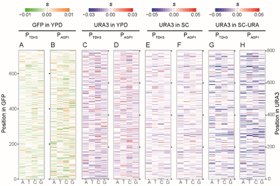 为了解决上述问题,陈小舒教授团队与杨建荣教授团队设计了一种新的实验方法来大规模测定蛋白质编码基因的所有单核苷酸突变的表型效应。团队使用该方法测定了绿色荧光蛋白 GFP(一个外源基因)与 URA3(一个在特定条件下必需的内源基因)两个基因内几乎所有突变,在两个活性相差10倍的启动子控制下的表型效应。研究发现(i)基因内至少42%的突变会因表达量改变而呈现不同的表型效应;(ii)与低表达时相比,必需基因高表达时更能容忍突变对基因功能的削弱作用;(iii)由于各种随机分子错误,基因表达升高会增强突变带来的细胞毒性。因此,上述结果直接证实了基因突变的表型效应具有表达依赖性,为理解上位效应的分子机制,和对基因组数据的精准解读提供了新的理论基础。
