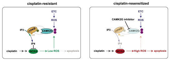 研究团队对CAMKII 促进卵巢癌铂耐药的机制进行系统解析,发现:CAMKII 同工酶 CAMK2G 在维持顺铂杀伤下的卵巢癌细胞内氧化还原稳态的调控中发挥重要作用;CAMK2G是铂耐药卵巢癌细胞内重要的ROS感受器。通过代谢分析、质谱、shRNA筛选等实验,研究发现卵巢癌细胞内源性的ROS升高并直接氧化修饰CAMK2G Met281/Met282 位点导致CAMK2G启动激活(priming)。启动激活后的CAMK2G直接磷酸化下游激酶ITPKB S174位点而增强ITPKB激酶活性,提高细胞内ITPKB的代谢产物磷酸肌醇IP4的水平。而高水平的IP4显著限制了顺铂诱导下的NOX4活性的急剧上升,降低NOX4产生的ROS水平,避免ROS诱发启动细胞凋亡。而NOX4产生的低水平ROS进一步刺激CAMK2G-pITPKB 的活化,从而在反馈回路中抑制顺铂诱导的NOX4激活,促进铂类药物杀伤下细胞内的氧化还原态的再平衡。因此,通过ROS-CAMK2G-pITPKB -NOX4 的稳态环路,没有杀死卵巢癌细胞的铂类药物可能使卵巢癌细胞耐药程度变的更强,ROS-CAMK2G-pITPKB-