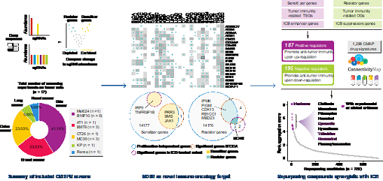尽管肿瘤免疫的CRISPR 筛选已经产生了大量的高通量数据,但迄今为止都没有系统的分析来整合这些数据。该研究通过在公共数据库中对肿瘤免疫CRISPR筛选研究进行全面的文献检索,并对这些筛选的结果进行整合,以识别参与肿瘤免疫的潜在调节因子。作者利用多种肿瘤的CRISPR 筛选数据(17套),TCGA 泛癌队列和ICB治疗数据集的多组学数据找到了具有治疗意义的新的免疫肿瘤靶点MON2,并构建了CTIS模型以预测癌症免疫治疗的反应。更为重要的是,他们通过改进signature matching算法识别出了与ICB具有协同作用的4种潜在药物,即Irinotecan,Quercetin,Trifluridine和Resveratrol。