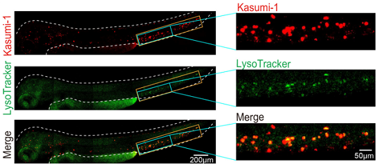 图1.耐药白血病细胞定位于斑马鱼低氧CHT部位且溶酶体显著增加。