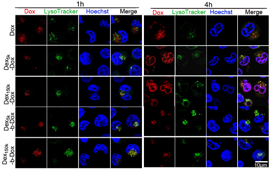 为了克服溶酶体相关的白血病化疗耐药,我院联合william威廉英国生物医学工程学院共同开发,以葡聚糖为原料的pH敏感性靶向溶酶体的葡聚糖-阿霉素药物(Dex-Dox)。该药物能通过胞吞作用高效进入耐药AML细胞,并在溶酶体酸性环境中有效释放阿霉素,显著增强阿霉素入核和杀伤耐药白血病细胞的能力(图2)。针对低氧诱导的白血病耐药机制,开发有效靶向溶酶体的pH敏感性化疗药物,显著改善化疗效果。