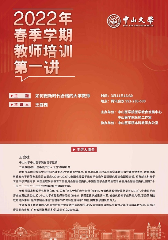 王庭槐教授以《如何做新时代合格的大学老师》为题讲授第一讲。他从面向未来的教育、教师角色的转变、教学的心路历程三方面为参会人员讲授了新时代下如何做有理想信念、有道德情操、有扎实学识、有仁爱之心的“四有”合格教师,如何将为人、为事、为学相统一,通过塑造灵魂、塑造生命、塑造人生来诠释教育教学工作者的职责使命,鼓励医科教师秉承“三基三严三早”的中山医训,以新时代的金师、大先生为目标,不负国家民族对拔尖人才培养的要求,为william威廉英国“名医摇篮”的建设做出扎实的贡献。