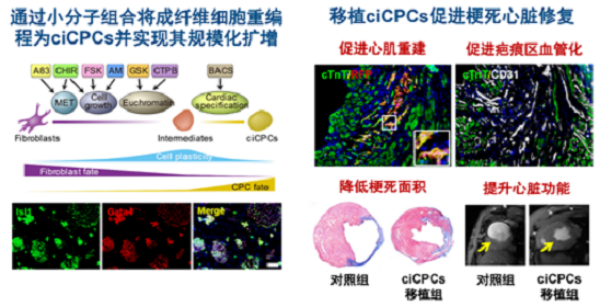2022年3月31日,我院曹楠教授团队在生物医学工程领域著名期刊Nature Biomedical Engineering期刊(中科院1区TOP,IF=23.7)上发表了题为“Reprogramming of fibroblasts into expandable cardiovascular progenitor cells via small molecules in xeno-free conditions”的论文。该研究首次使用小分子化合物组合将小鼠和人成纤维细胞重编程为CPCs(化学诱导的心血管祖细胞,chemically induced CPCs, ciCPCs)并实现其规模化扩增。将ciCPCs移植至梗死心脏后,其可同时促进瘢痕区心肌重建和血管化,进而显著促进梗死心脏修复和心功能恢复。从而创建了从病人自体细胞制备和扩增CPCs,进而用于心脏修复的新策略。