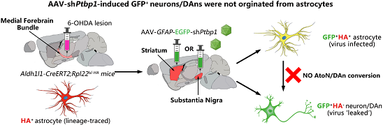 AAV-shPtbp1-GFP诱导产生的GFP+神经元/DA神经元并非来源于星型胶质细胞