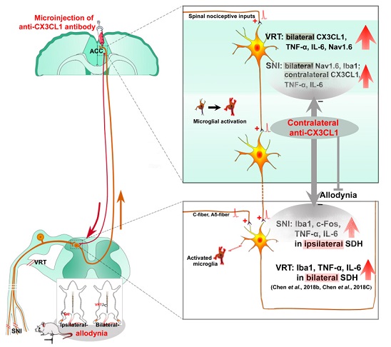 近日,我院臧颖副教授课题组研究发现,单侧坐骨神经部分性损伤(spared nerve injury, SNI)后,手术对侧ACC中肿瘤坏死因子α (TNF-α)、白细胞介素-6 (IL-6)和趋化因子CX3CL1表达增加,而伴有镜像痛的L5腹根横断模型(L5 ventral root transection, L5-VRT)表现出更为严重的双侧ACC神经炎症反应。此外,L5-VRT模型诱导的电压门控钠通道Nav1.6 (SCN8A)的高表达也先于SNI。通过化学遗传技术DREADD-Gq和Gi调控ACC谷氨酸神经元可显著改变ACC脑区CX3CL1的表达,提示外周神经损伤后ACC脑区异常兴奋是CX3CL1神经炎症级联反应的重要原因。更为有意义的是,抑制ACC内CX3CL1可阻断SNI诱导的ACC神经炎症和Nav1.6,并削弱机械痛觉的诱导和维持,神经损伤对侧ACC脑区给予抗CX3CL1中和抗体可直接调控同侧脊髓背角神经元兴奋性标志物(c-Fos)、小胶质细胞标志物(Iba1、CD11b)以及炎症细胞因子(TNF-α、IL-6)的表达,进一步揭示ACC脑区CX3CL1介导的下游级联免疫反应在下行易化脊髓痛信息传递中发挥关键作用,导致痛敏增强,甚至镜像痛。以上工作从神经免疫学角度出发,为临床神经病理性疼痛及镜像痛的治疗提供了新的分子靶点。