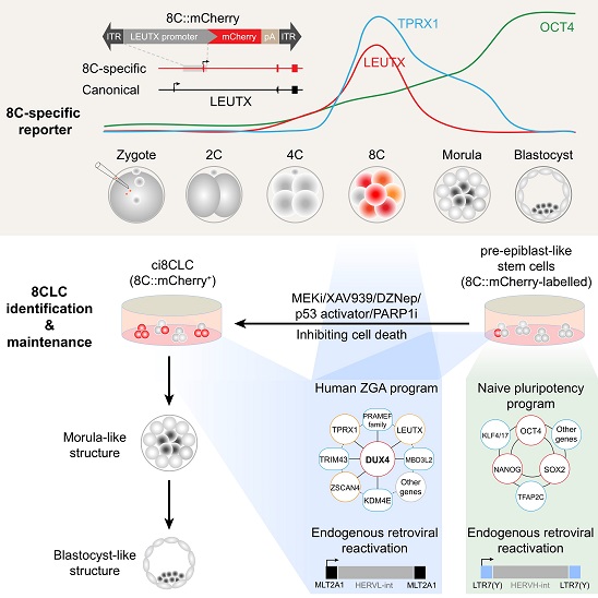 卵子受精后不久,转录沉默的基因组重新激活,大量基因开始表达,此过程被称为合子基因组激活(Zygotic genome activation,ZGA),其是早期胚胎发育中最重要的生物学事件之一。由于人类早期胚胎发育研究的伦理和实验手段限制,人类ZGA的启动机制以及异常ZGA对人类胚胎发育的影响尚不清楚。因此,建立人类卵裂期胚胎的干细胞模型以在实验室中重现人类生命的产生和发展过程,这对于理解人类早期胚胎发育规律和出生缺陷等疾病的发生机理,具有重要意义。