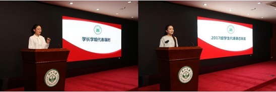 2016级临床医学(八年制)冯芮嘉作为学长学姐代表发言,强调临床实习是将五年学习获得的理论知识与实践结合的一次深切践行,要主动学习,胆大心细,对病人高度负责。2017级临床医学(八年制)学生代表文晗作表态发言,表示将坚守初心,尽快转变角色,用心投入到实践教学中,刻苦学习,关爱他人,练就真本领。