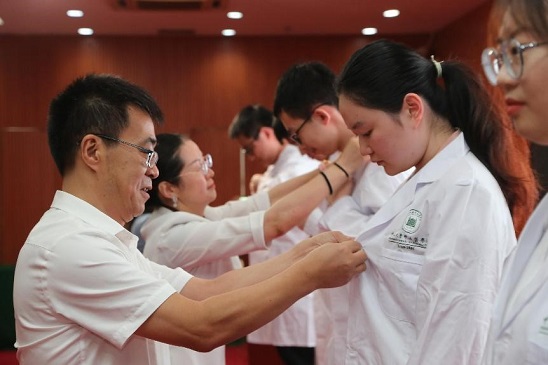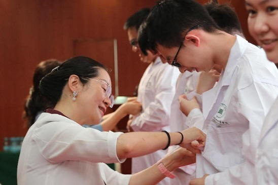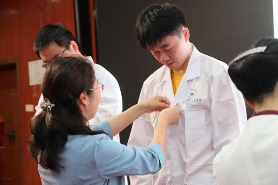 白袍象征着纯洁、奉献、责任。旋律缓缓响起,实习生代表从张琪书记、周家国副院长、王淑珍副院长手中接过一件件“战袍”,即将开启他们崭新的学习阶段。