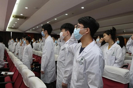 “健康所系,性命相托。当我步入神圣医学学府的时刻,谨庄严宣誓:我志愿献身医学,热爱祖国,忠于人民,恪守医德,尊师守纪,刻苦钻研,孜孜不倦,精益求精,全面发展。”在张琪书记的带领下,身着整齐白大褂的2017级八年制实习生,全体起立举起右手,郑重重温医学生誓词。