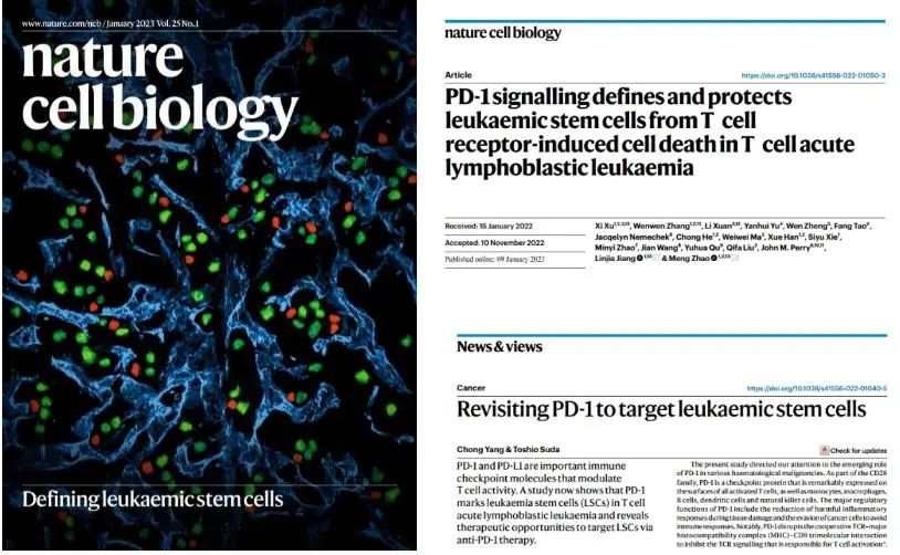 2023年1月 Nature Cell Biology杂志以封面文章的形式发表了我院赵萌教授团队的研究成果“PD-1 signaling defines and protects leukemic stem cells from T-cell-receptor-induced cell death in T-cell acute lymphoblastic leukemia”,并配发了同期评论文章1。该研究明确了PD-1分子是T-ALL白血病LSC的标记物,并证实PD-1阻断疗法是清除LSC治疗T-ALL的有效手段,揭示了PD-1不依赖其肿瘤免疫作用的新功能。