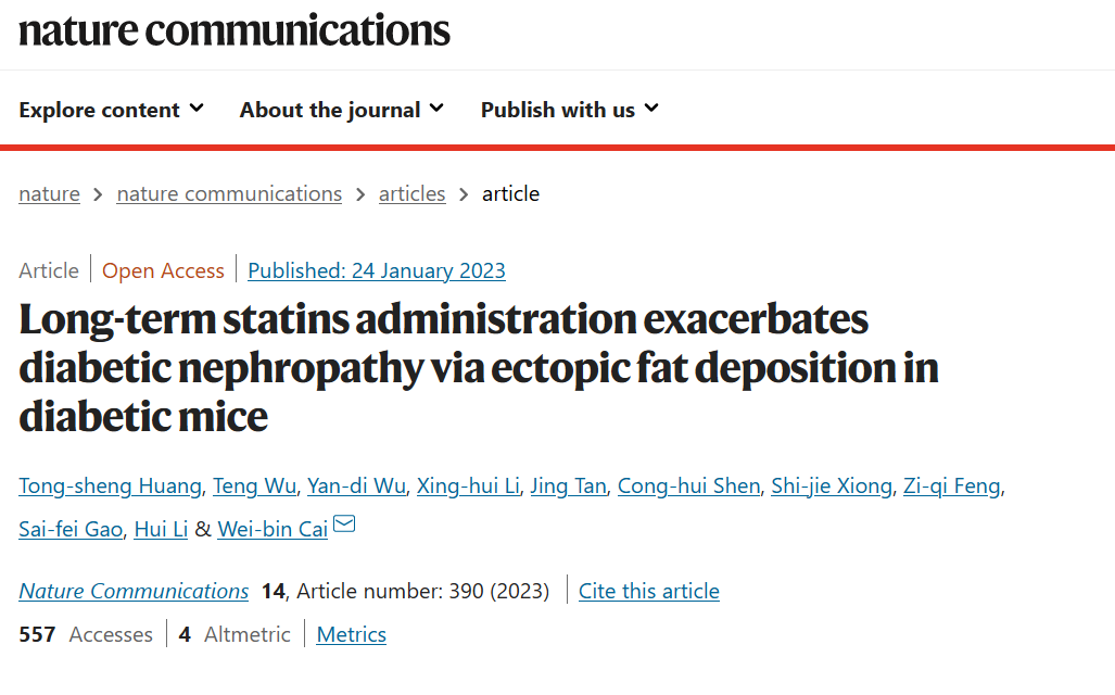 随着胰岛素的临床应用和新型治疗手段的出现,糖尿病病人寿命延长,原本隐匿或晚发的糖尿病相关器官并发症“从幕后走到前台”,逐渐成为糖尿病患者死亡的主要原因。脂毒性在2型糖尿病发生发展过程中扮演重要角色,细胞内脂质异位沉积引起器官慢性损伤和功能障碍是糖尿病并发症的重要机制。在临床上,降脂、控脂是糖尿病及其并发症防治的重要策略,中华医学会、美国糖尿病学会的最新2型糖尿病防治指南均明确推荐糖尿病患者应接受他汀类药物进行降脂治疗。目前,对于糖尿病患者长期使用他汀类药物降脂治疗的风险,还缺乏明确的临床研究数据。2023年1月24日,Williamhill中文蔡卫斌教授课题组在Nature Communications期刊发表了题为“Long-term statins administration exacerbates diabetic nephropathy via ectopic fat deposition in diabetic mice”的研究论文,该研究采用比较医学研究策略,借助糖尿病动物模型,证实长期服用他汀类药物在糖尿病小鼠中促进了糖尿病肾病进展。