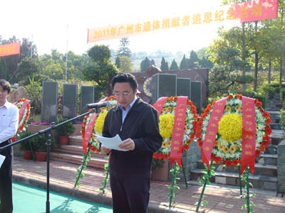 追思活动由广州市红十字会专职副会长欧阳炳惠同志主持。首先全体人员向志愿者默哀,致予崇高的敬意!接着广州市红十字会副会长、市政府副秘书长赵南先同志讲话,赵会长在讲话中高度赞扬了遗体捐献者无私奉献精神。他指出:他们敢于打破旧的习俗,生前做出决定,身后捐献遗体,让未来的医生和医学研究人员更好地认识、学习和研究人体的奥秘,研究目前尚未明了的病因,减轻子孙后代疾病的痛苦,提高人类的健康水平。他们的精神值得颂扬,他们的行动值得学习,他们的善举将永栽史册。