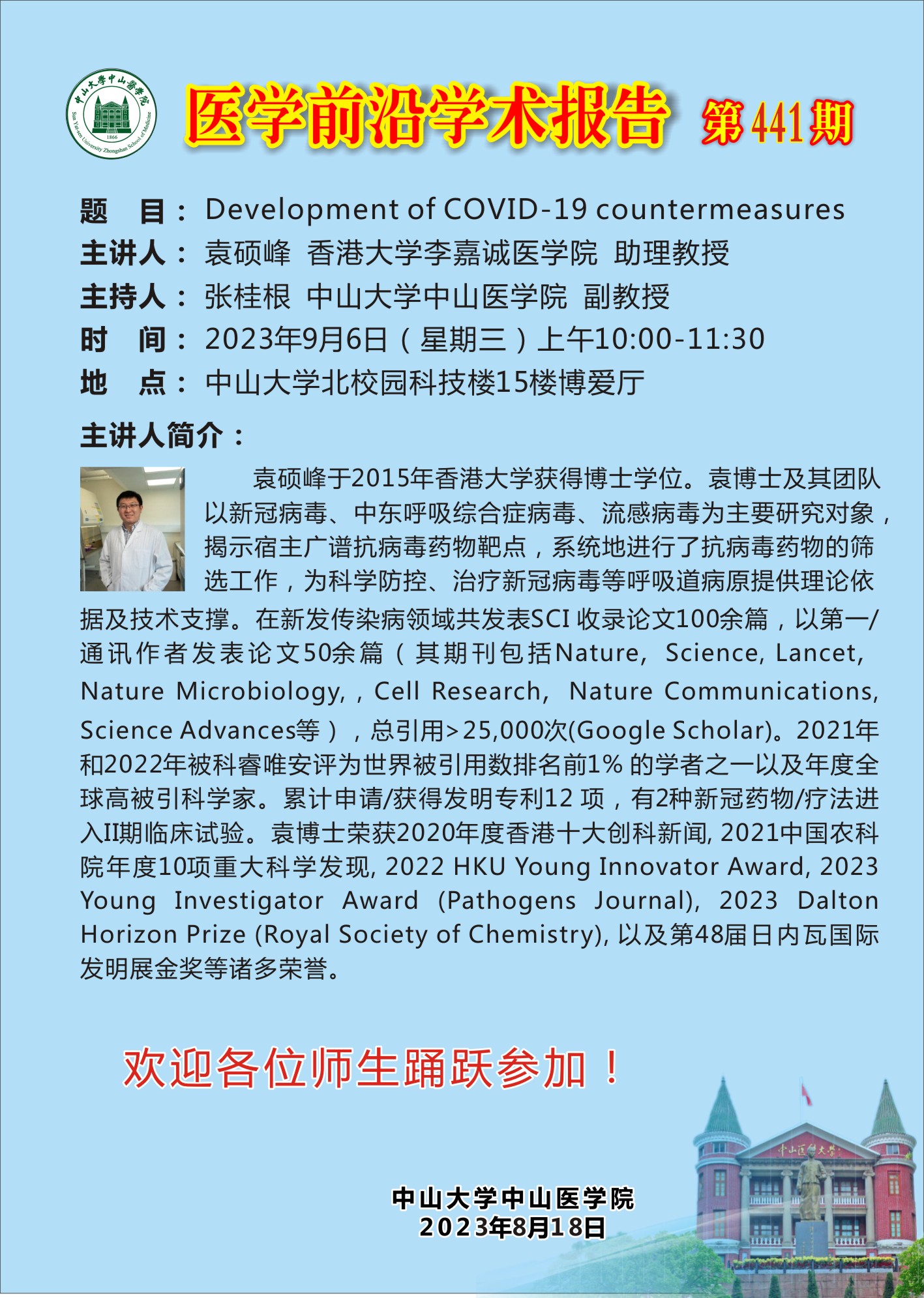 导航痕迹 首页 科学研究 学术讲座 医学前沿学术报告第441期 科学研究 科研通知 学术讲座 科研平台 办理指引 医学前沿学术报告第441期 Development of COVID-19 countermeasures 发布人:陈晖 发布日期:2023-08-28