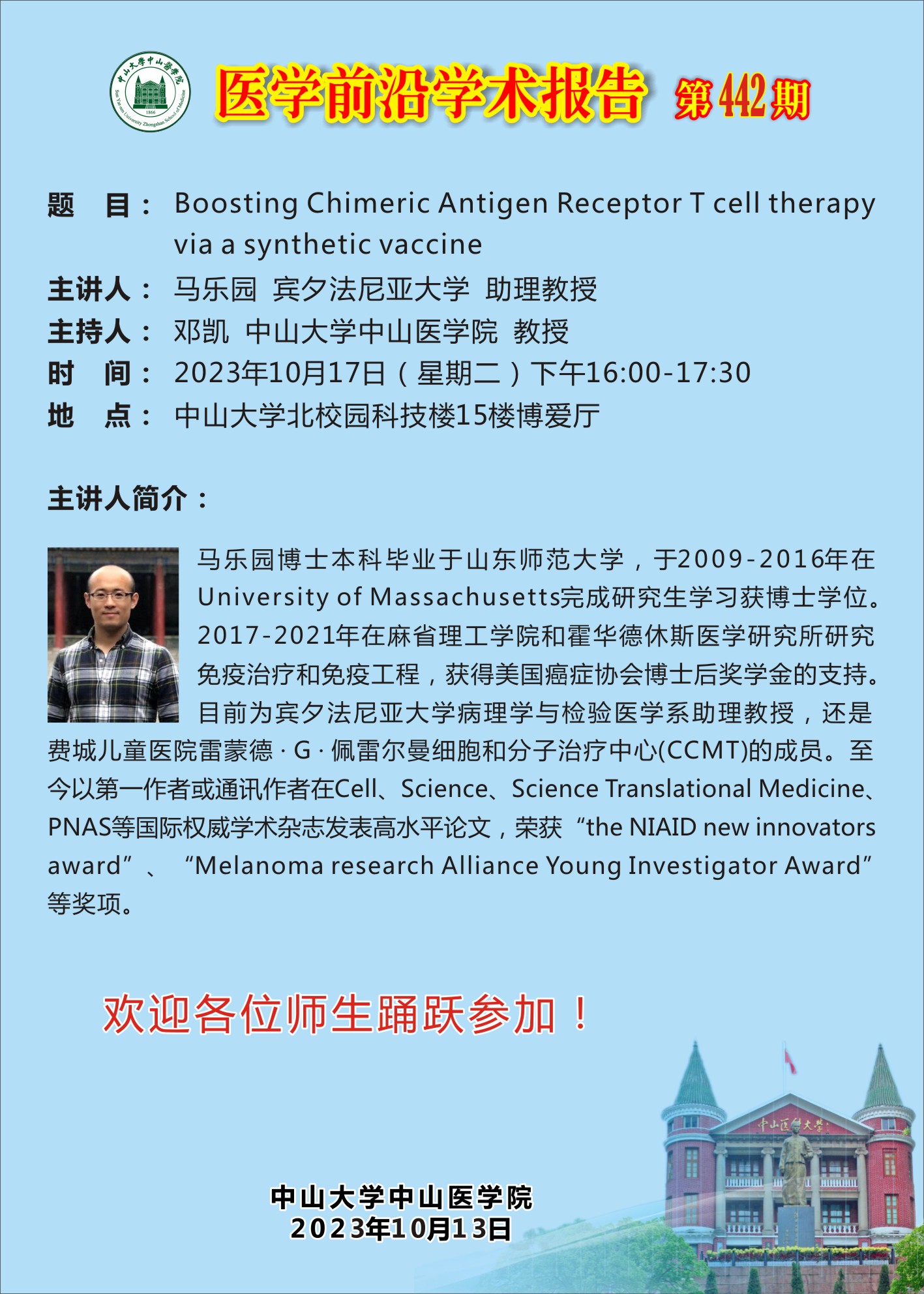 导航痕迹 首页 科学研究 学术讲座 医学前沿学术报告第442期 科学研究 科研通知 学术讲座 科研平台 办理指引 医学前沿学术报告第442期 Boosting Chimeric Antigen Receptor T cell therapyvia a synthetic vaccine 发布人:陈晖 发布日期:2023-10-14