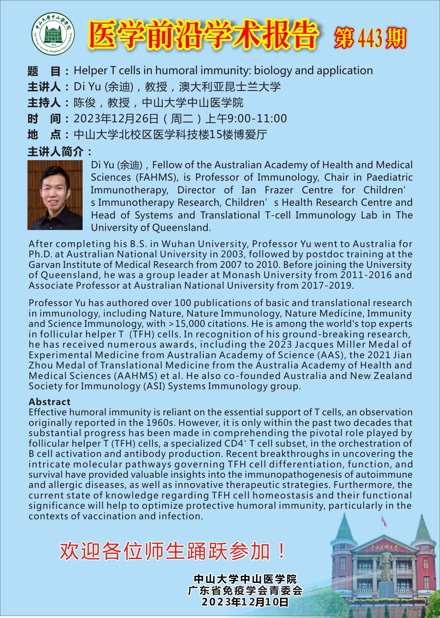 导航痕迹 首页 科学研究 学术讲座 医学前沿学术报告第443期 科学研究 科研通知 学术讲座 科研平台 办理指引 医学前沿学术报告第443期 Helper T cells in humoral immunity: biology and application 发布人:陈晖 发布日期:2023-12-08