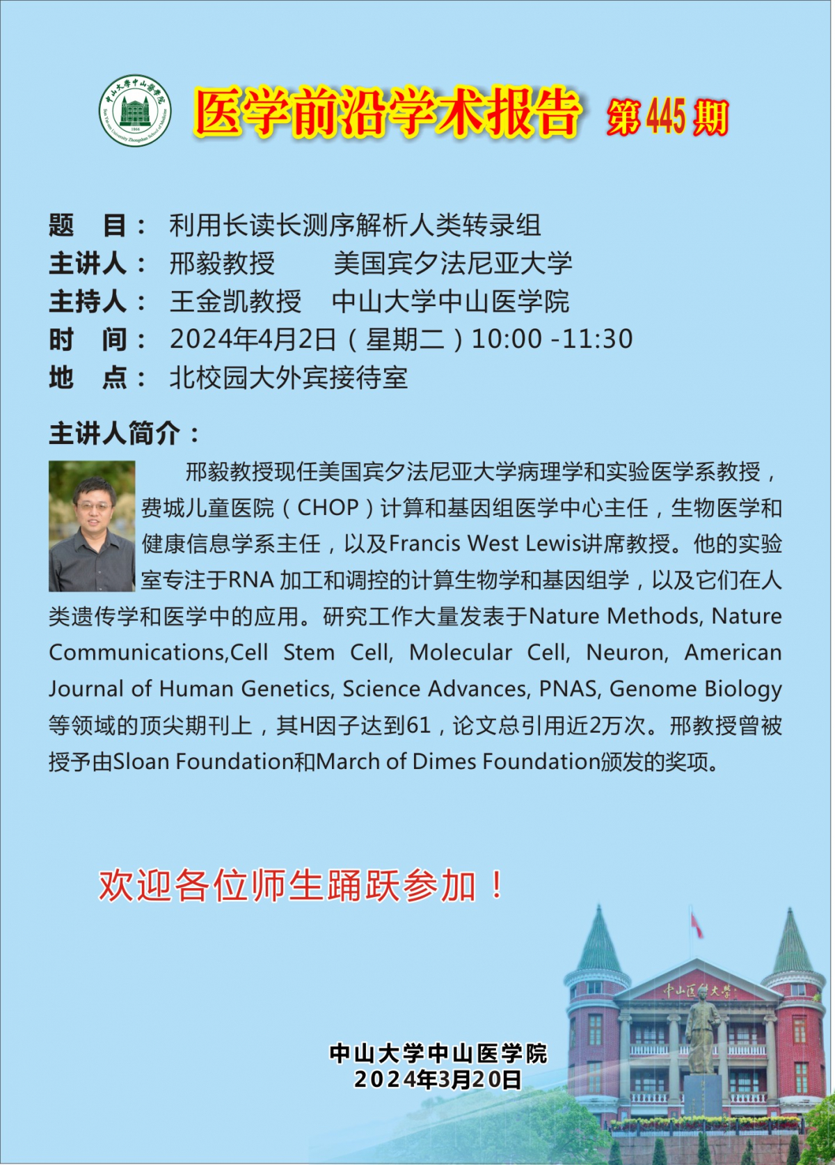 导航痕迹 首页 科学研究 学术讲座 医学前沿学术报告第445期 科学研究 科研通知 学术讲座 科研平台 办理指引 医学前沿学术报告第445期 利用长读长测序解析人类转录组 发布人:管理员 发布日期:2024-03-27